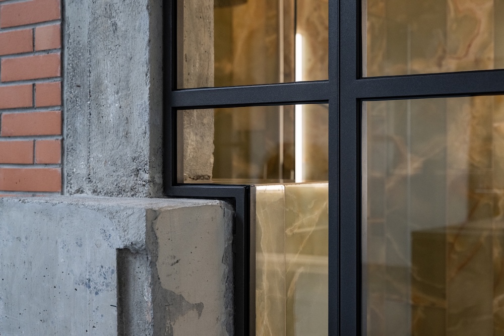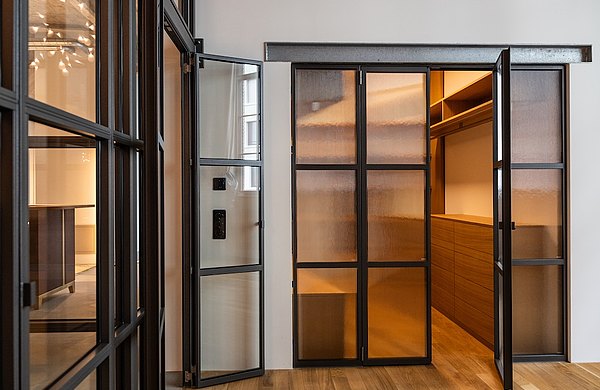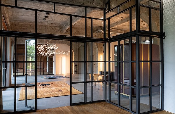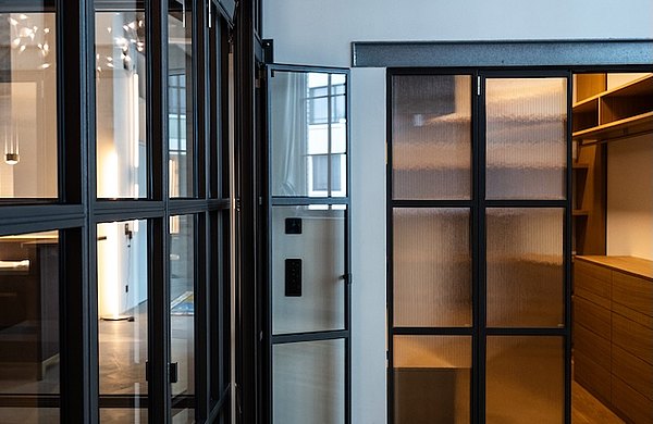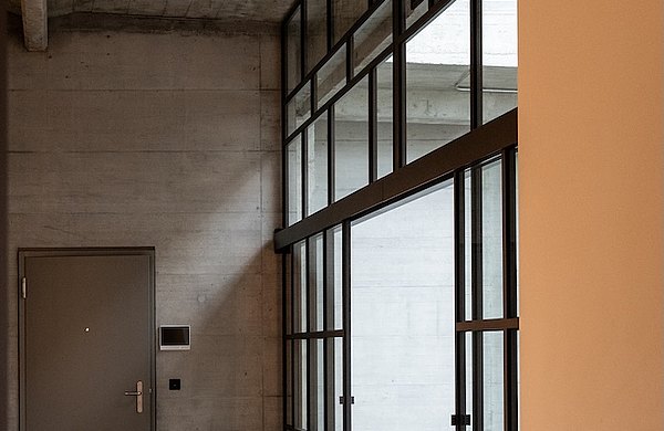 Schlanke Profile, im Farbton Iron Grey, rahmen die Glasfüllungen und greifen den industriellen Charakter der einstigen Papierfabrik auf. Ihre Teilung und Proportion orientieren sich an den Sprossenfenstern der sanierten Fassade – innen wie aussen entsteht ein harmonisches Gesamtbild.